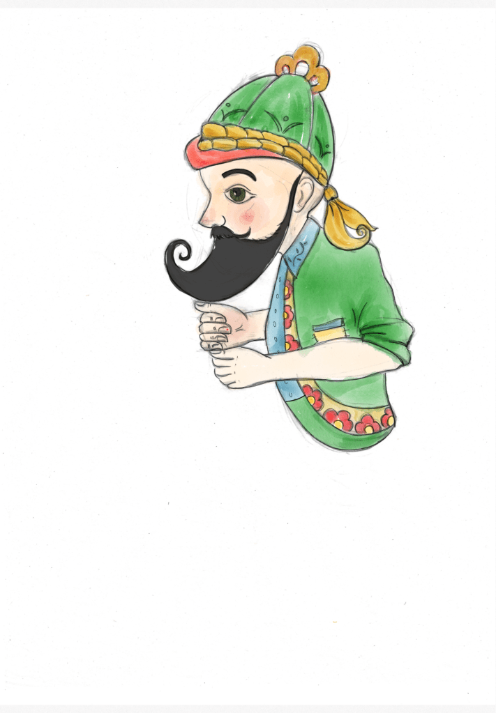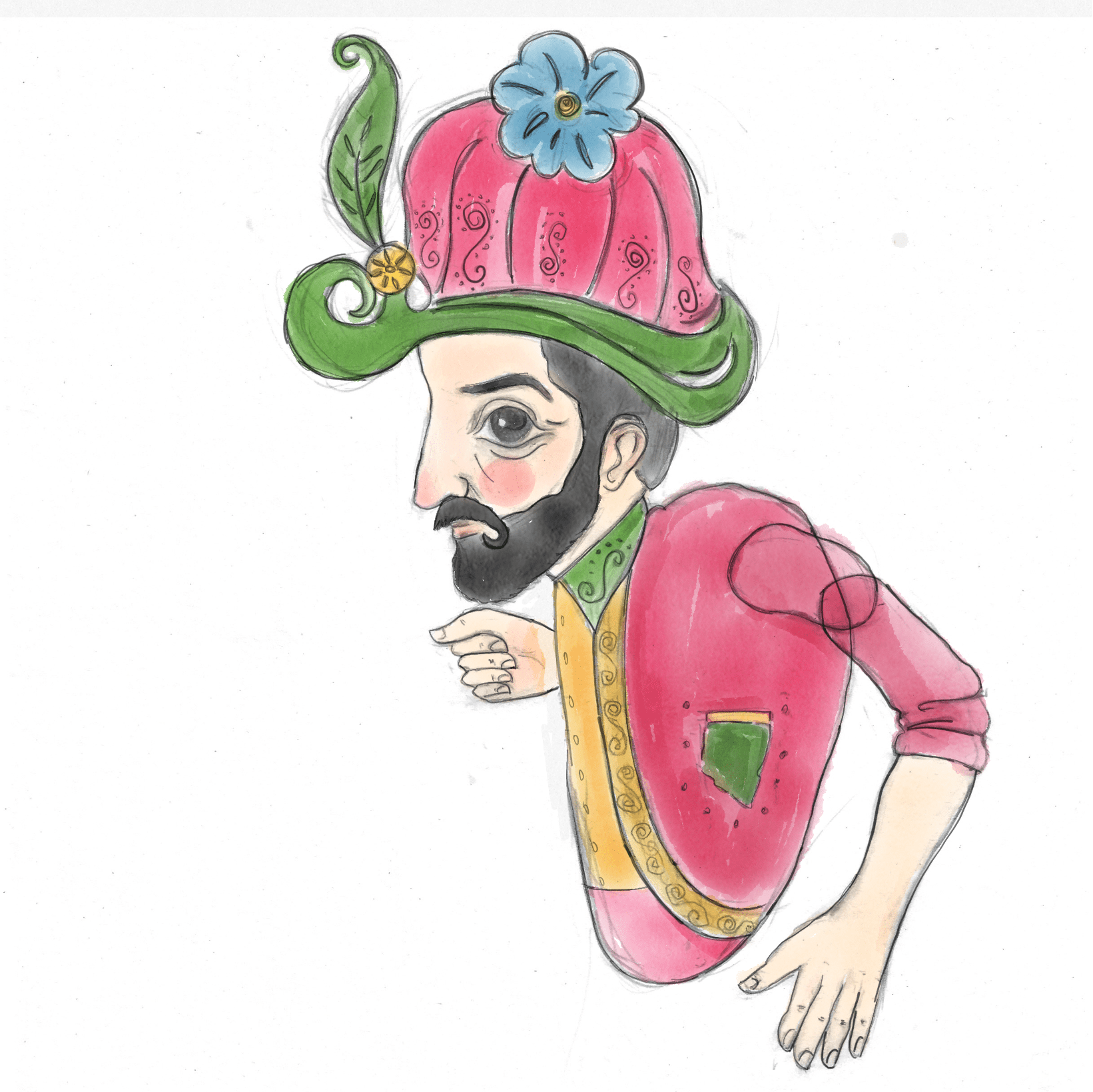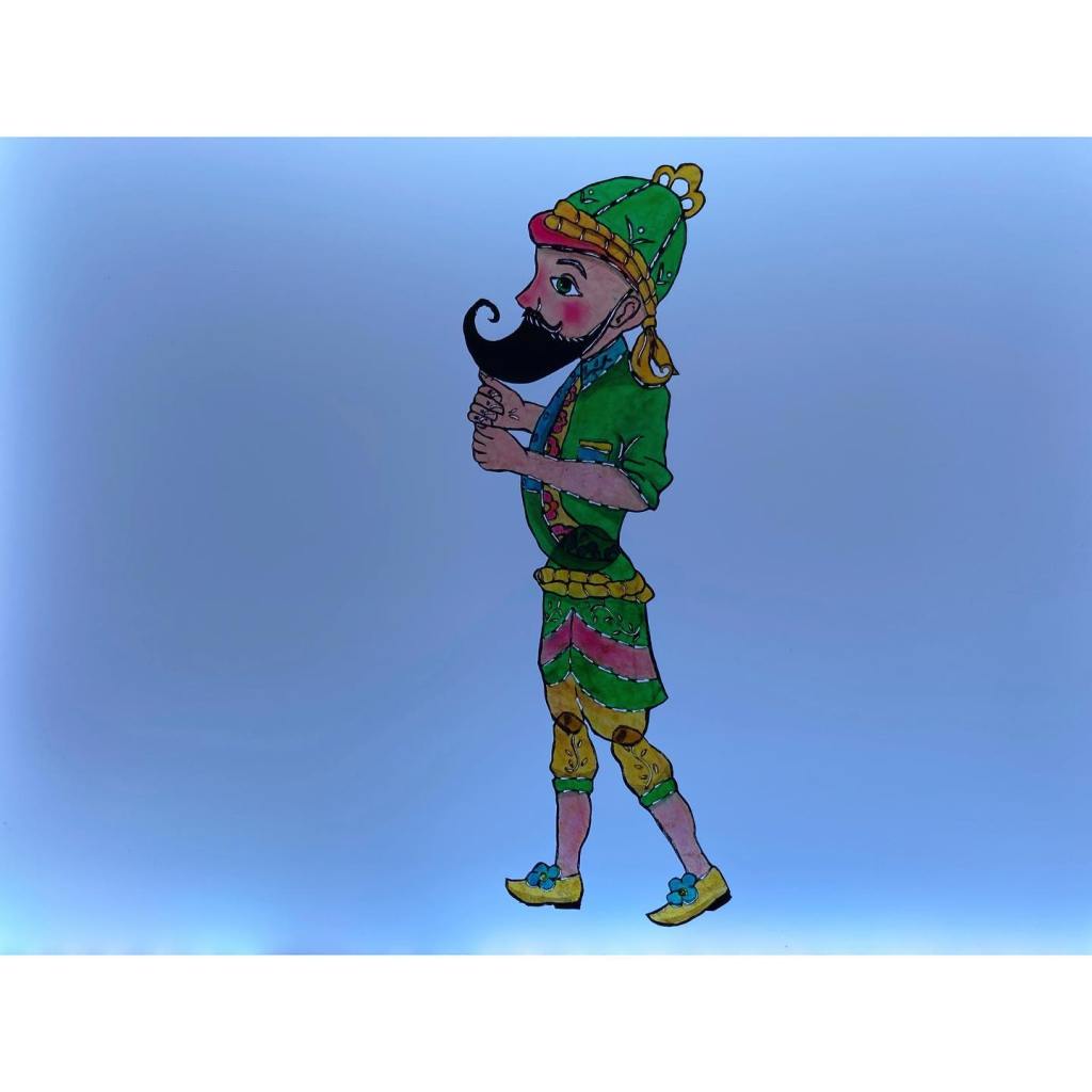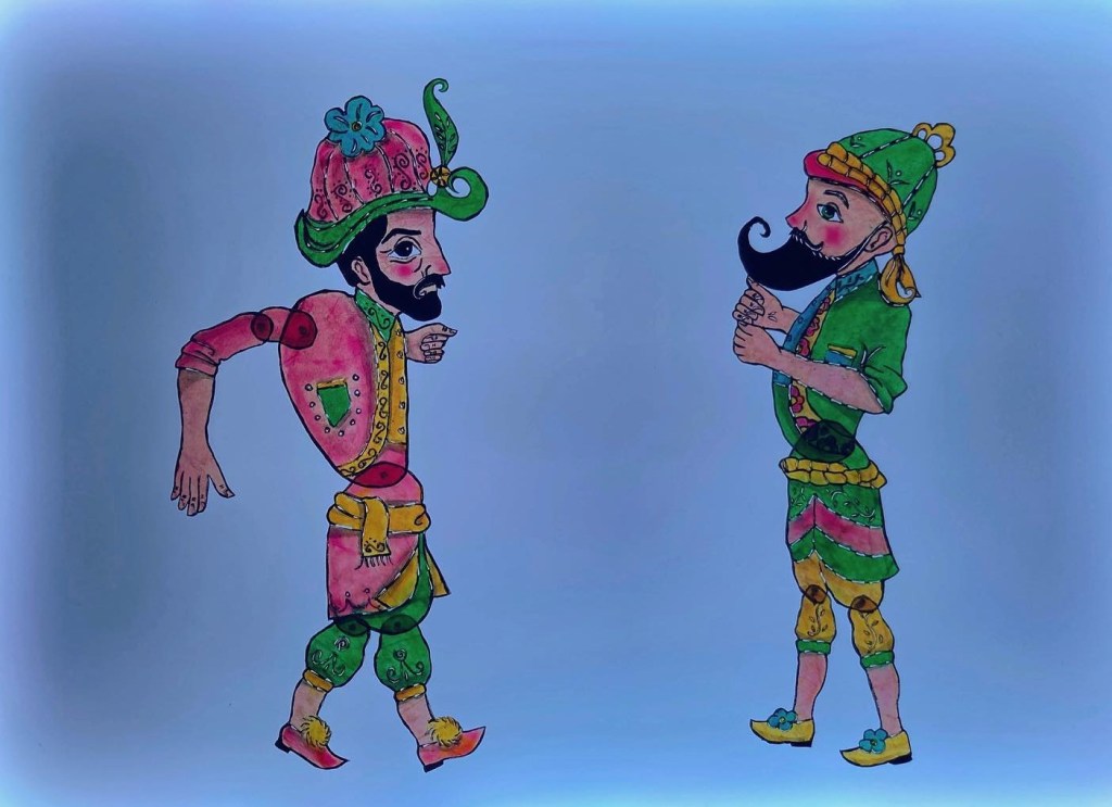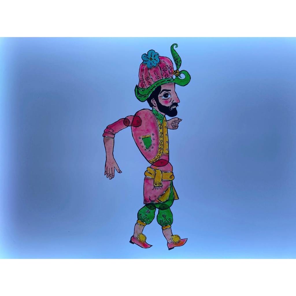 Traditional Turkish Karagöz 2D figurine, made from cow leather (30cm) and painted with transparent paints. The figures create special effects by the passing of the light from the semi- transparent leather. The two main traditional character are Karagöz&Hacivat which is the name of the play everytime.